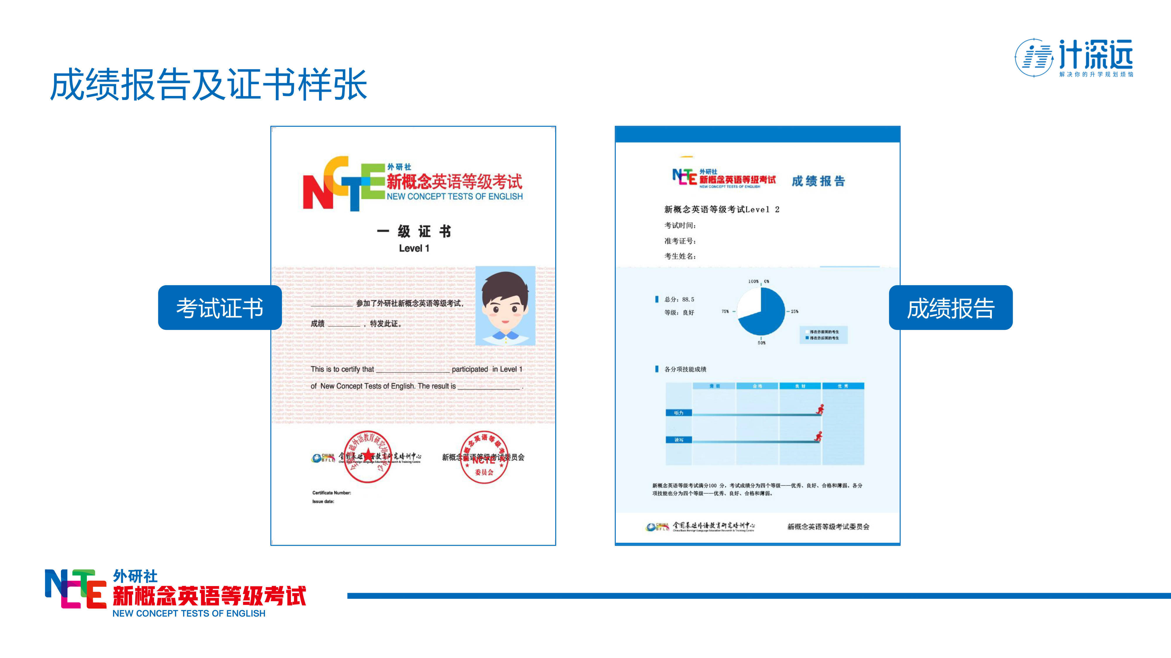 NCTE由外研社自主研制,权威机构认证,考生取得的证书是由全国根底外语教育研讨培训中心和外研社新概念英语等级考试组委会一起签发。