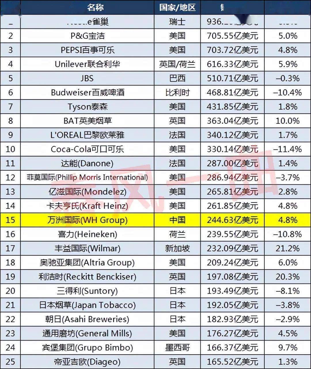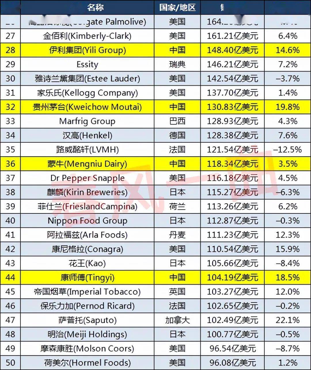 最后来看看看我国5家上榜的快消品企业,万洲国际销售额为244.63亿美元,是全球第15大快消品企业,实力远超其它4家;伊利集团排名第28位,贵州茅台排名第32位,蒙牛排名第36位,康师傅排名第44位,其中康师傅是新上榜快消品企业,实力也是最弱的。