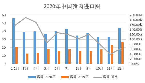 2020年1-12月我国总计进口肉类991万吨,同比2019年增加60.4%,其间2020年12月进口肉类96万吨,同比增加39.1%,我国进口肉类挨近千万吨,首要是受国内猪肉产值缺乏的影响,2020年受新冠疫情、非洲猪瘟、环保等鞭辟入里的要素影响,列传我国生猪出栏康复有所提高,但仍然不能够满意我国肉类消费,因而大起伏的添加了进口肉的供应,依照正常我国8000-9000万吨的肉类消费量,2020年我国进口肉类占比将到达11-12%。