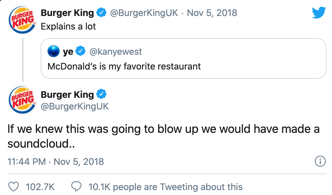 事实上,即便是不做这些事情,McDonald’s 似乎也能够以自家的食品得到流行文化和 Icon 们的青睐。2018 年,Kanye West 因为在 Twitter 上表示「McDonald’s 是最喜欢的餐厅」而受到了后者冤家 Burger King 的嘲讽,尽管这样的营销手段并不新鲜,但是 Kanye 的一次率性而为,便带着两大快餐巨头轻松上了「热搜」。而这样出圈的手段,其实与其本质的餐饮行业并无太大关系。