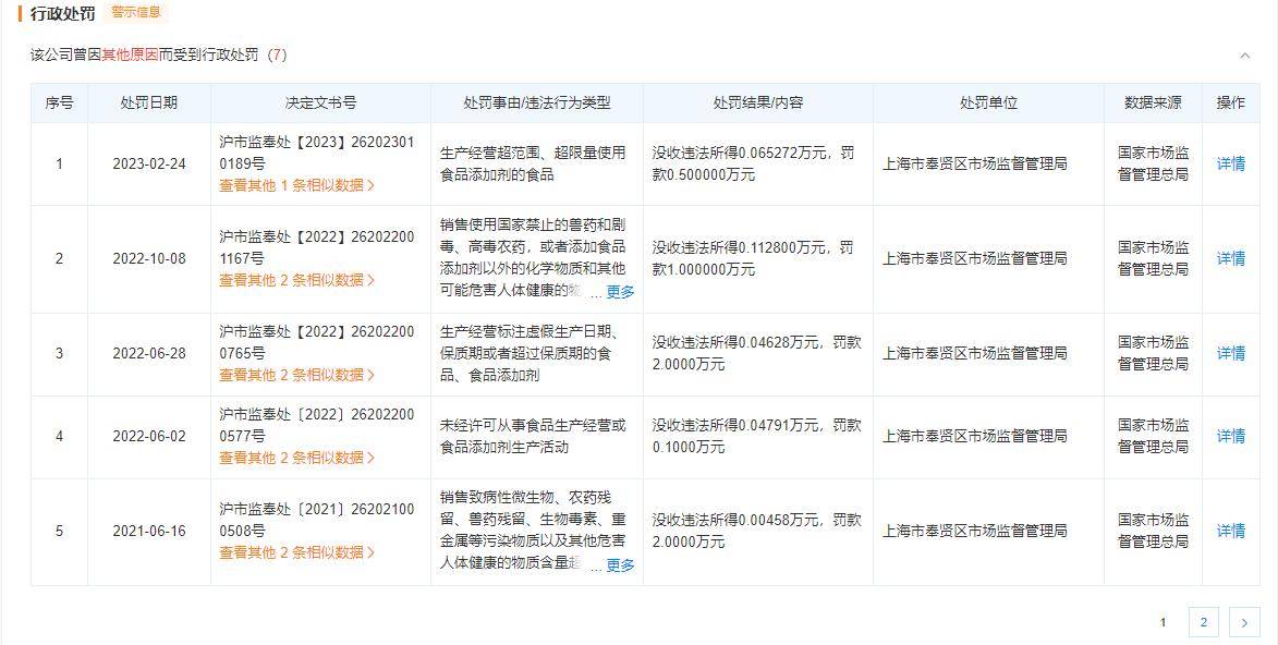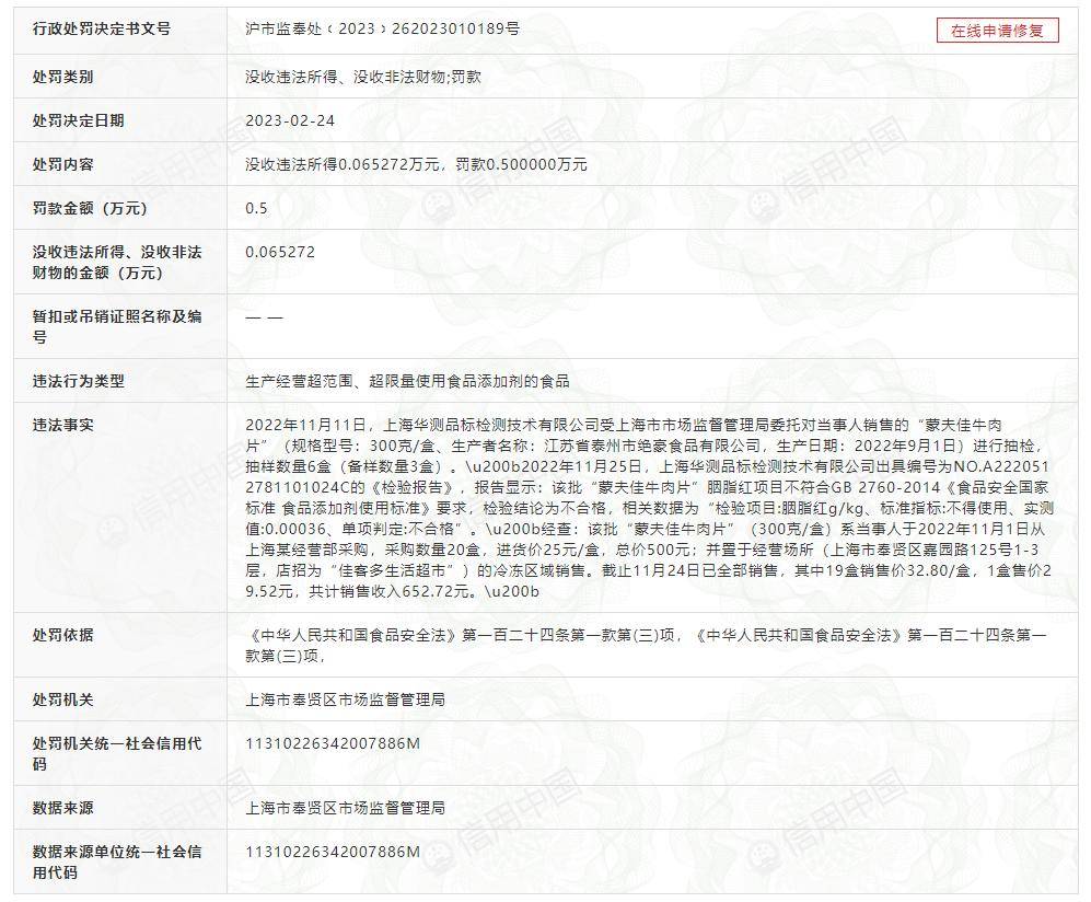 信誉我国体系信息数据显现,2023年02月24日,上海臻祺工贸有限公司因出产运营超范围、超定量运用食物添加剂的食物“蒙夫佳牛肉片”(规格型号:300克/盒、出产者称号:江苏省泰州市绝豪食物有限公司,出产日期:2022年9月1日),被上海市奉贤区商场监督管理局罚款5000元,并没收违法来得到的652.72元。