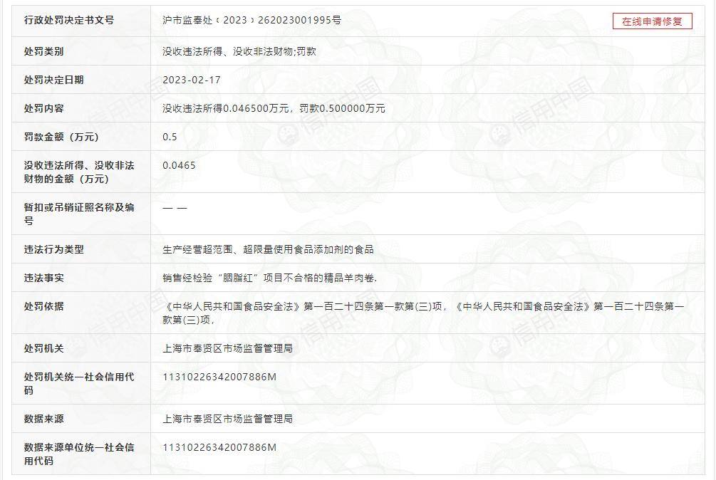 我国质量新闻网经过信誉我国还了解到,2023年2月17日,上海臻祺工贸有限公司第四分公司因出售经查验“胭脂红”项目不合格的精品羊肉卷,上海市奉贤区商场监督管理局罚款5000元,并没收违法来得到的465元。