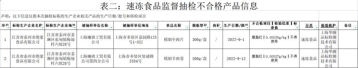 经查,上海臻祺工贸有限公司运营的标称江苏省泰州市绝豪食物有限公司出产的精制牛肉片(出产日期2022年9月1日)胭脂红不符合食物安全国家规范规则。