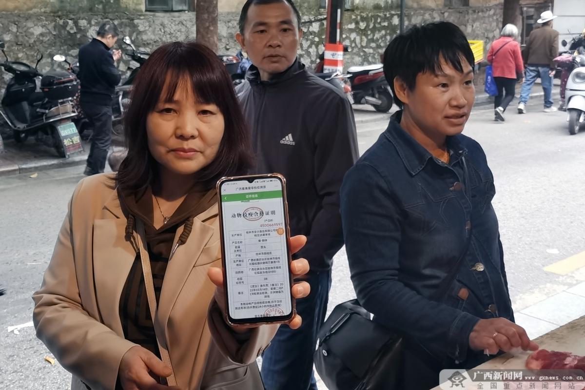 3月15日,一女士在临桂区政农贸商场购买猪肉时扫码查询猪肉的相关信息。梁启胜 摄